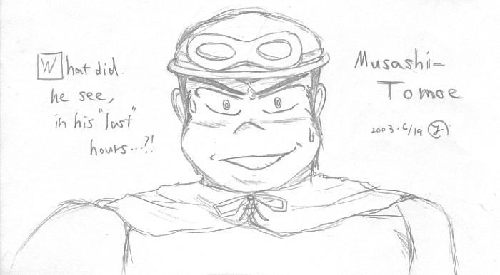 | <Musashi Tomoe〜巴武蔵〜> …これは、あるマシンに乗り、ある場所へ向かう彼をイメージして書いたものです。 そのマシンの名は、「コマンドマシン」。そして目指すは、凶悪なる最強のメカザウルス…「無敵戦艦ダイ」。 最期の瞬間、彼が見たものは何なのか…? |