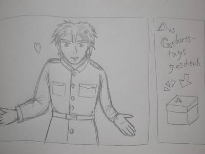 "Red keinen Unsinn! Warum vergisst man das Geburtstag des Freundes?" "..." "Ganz Natuerlich! Oder?!" "...Ja, du hast recht...Ich freue mich wirklich, danke" 「馬鹿なこと言うなよ〜!友達の誕生日忘れるとかないって!」 「…」 「当ったり前のこと、だっろ〜?!」 「…ああ、お前の言うとおりだ…本当にうれしいよ、ありがとう」 |