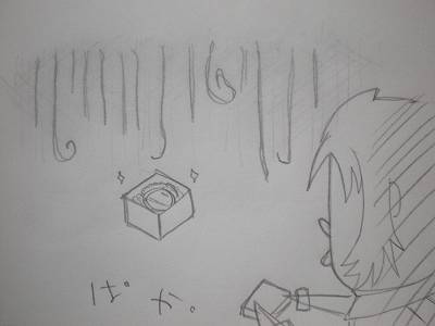 "So, das ist fuer dich, Dracula!" "W...was?" "Ha, Mach keine Witze! Das ist nur eine Kleinigkeit, aber ich hoffe, dass du das magst!" "Ah..." 「だから!これ、お前に、ドラクゥラ!」 「な…何だ?」 「はん、冗談言うなよ!つまんないものだけどさ、気に入ってくれりゃいいんだけど!」 「あ…」 |